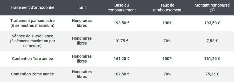 Les tarifs d'un chirurgien-dentiste ou un chirurgien dentiste spécialiste orthodontiste , conventionnés sont libres et sont pris en charge sur la valeur de base de remboursement par l'Assurance Maladie et remboursés généralement à 70 %, sauf pour les actes d'orthodontie qui sont remboursés à 100 % de la base de remboursement ou tarif de responsabilité.